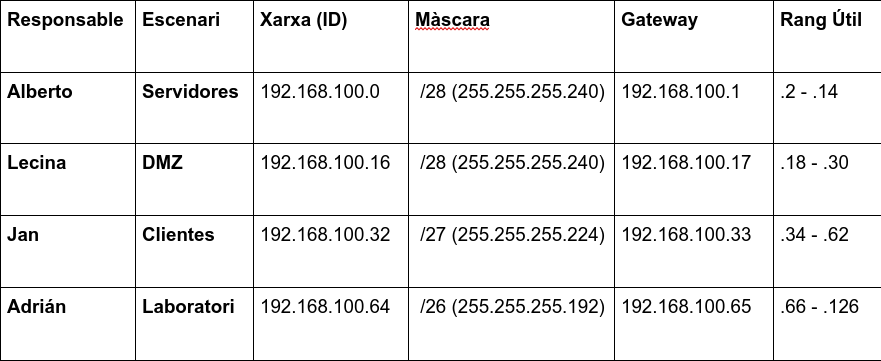 Hem adaptat la xarxa original de l’illa (172.25.0.0/16) a un nou escenari corporatiu basat en el rang 192.168.100.0/24. Hem utilitzat VLSM per segmentar la xarxa segons les necessitats de cada departament: