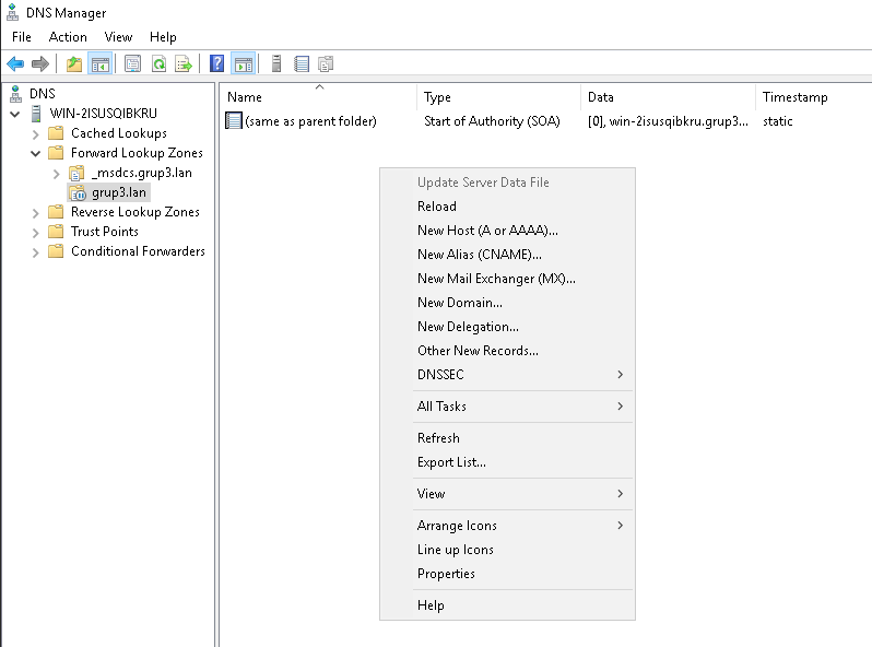 Un cop finalitzada la configuració a Windows, es pot observar la zona de cerca inversa ja operativa, vinculant la IP 133 amb el nom del host. La vista general del DNS Manager confirma que tota l’estructura de la zona grup3.lan (NS, A i CNAME) està correctament llistada i preparada.